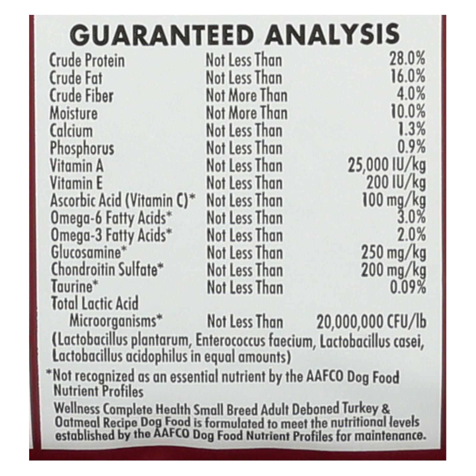 Wellness complete health small breed deboned turkey & oatmeal adult dog food features a specially designed formula to give your small-breed adult dog the nutrition he needs for an active lifestyle. Crafted with omega-3 fatty acids, this delicious dog food promotes healthy skin and coat. High-quality deboned turkey fuels energy levels and supports strong muscles, while probiotics and healthy fiber help improve digestive health. Each bag holds 4 lbs. Of wellness turkey and oatmeal dog food.