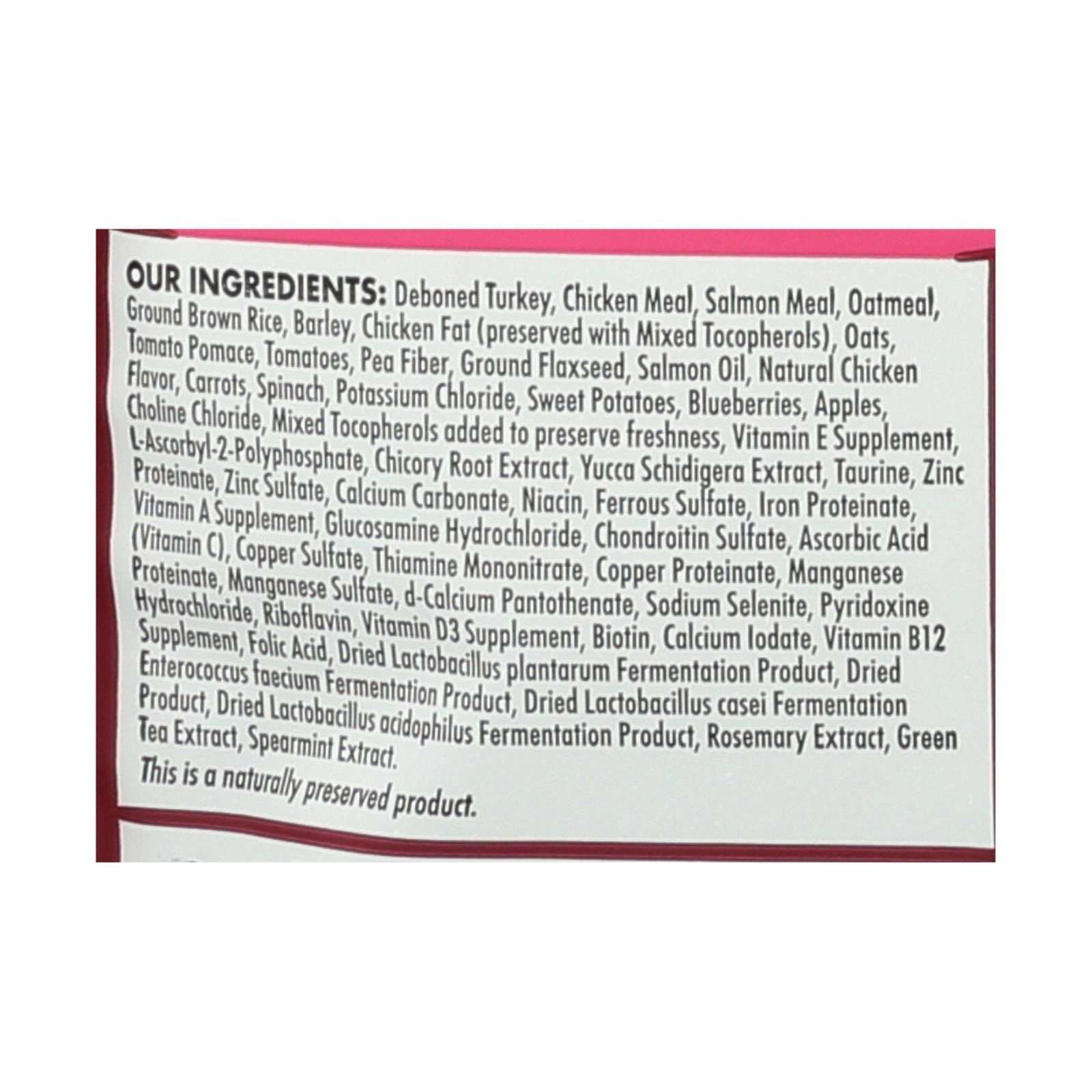ingredients : deboned turkey;chicken meal;salmon meal;oatmeal;ground brown rice;barley;chicken fat;preserved with mixed tocopherols;oats tomato pomace;tomatoes;pea fiber;ground flaxseed;salmon oil;natural chicken flavor;carrots;spinach;potassium chloride;sweet potatoes;blueberries;apples;choline chloride;mixed tocopherols added to preserve freshness;vitamin e supplement;l-ascorbyl-2-polyphosphate;chicory root extract;yucca schidigera extract;taurine;zinc proteinate;zinc sulfate;calcium carbonate;niacin;ferrou