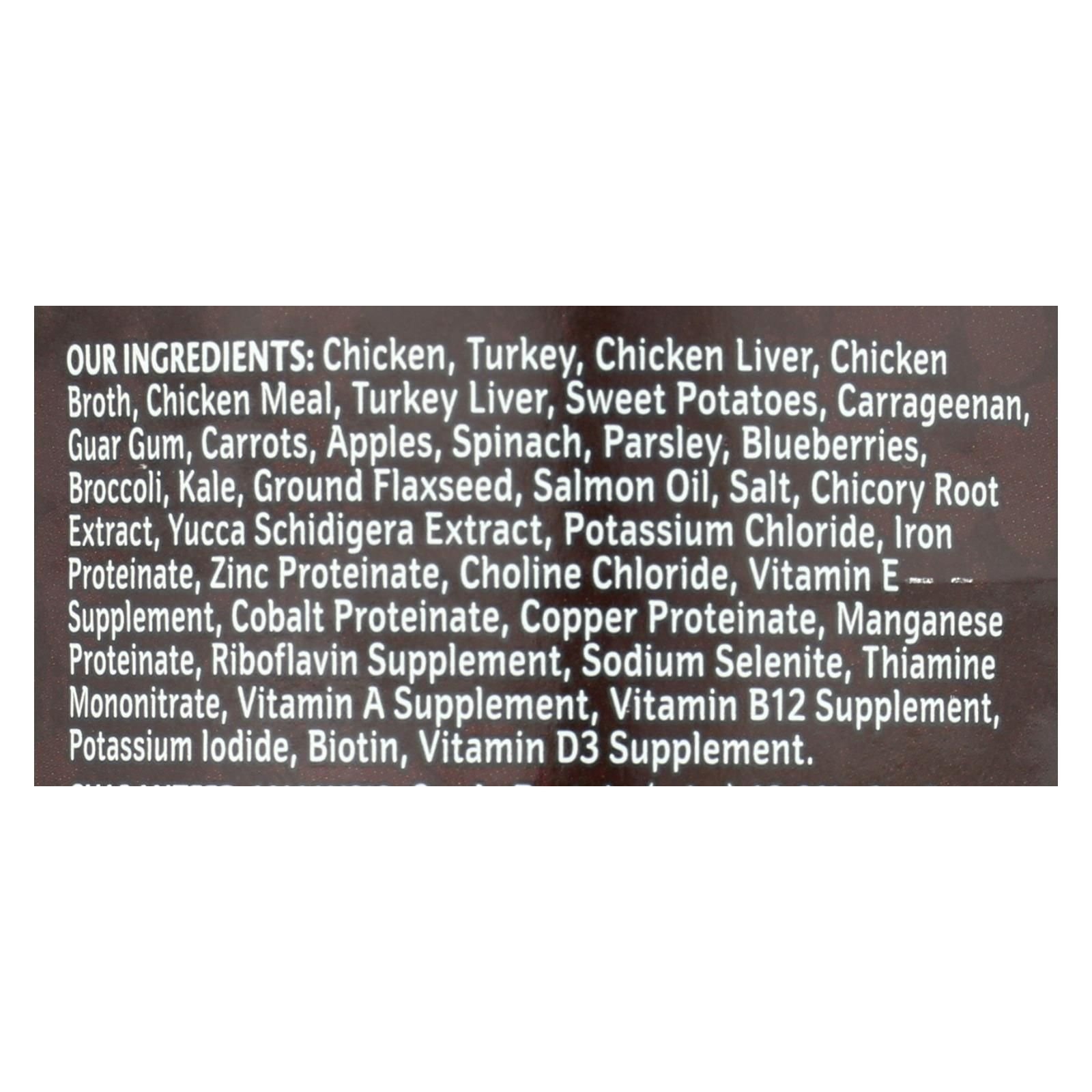 ingredients : chicken;turkey;chicken liver;chicken broth;chicken meal;turkey liver;sweet potatoes;carrageenan;guar gum;carrots;apples;spinach;parsley;blueberries;broccoli;kale;ground flaxseed;salmon oil;salt;chicory root extract;yucca schidigera extract;potassium chloride;iron proteinate;zinc proteinate;choline chloride;vitamin e supplement;cobalt proteinate;copper proteinate;manganese proteinate;riboflavin supplement;sodium selenite;thiamine mononitrate;vitamin a supplement;vitamin b12 supplement